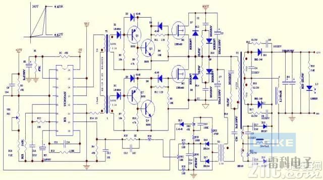 ●輸出兩個(gè)繞組,第一個(gè)是能夠提供27V30A的主繞組,第二個(gè)是能夠提供140V啟動(dòng)電壓,經(jīng)過串聯(lián)在整流二極管前面的電容來限制啟動(dòng)機(jī)電流<0.5A電流的。當(dāng)開機(jī)時(shí)輸出電壓根據(jù)輔助繞組的反饋電壓,開環(huán)狀態(tài)啟動(dòng)繞組電壓被限制到140V左右,氙氣燈在高達(dá)140V電壓立即啟動(dòng)后,由于高壓繞組的串聯(lián)電容存在,這個(gè)電流無法高起來。而一旦氙氣燈啟動(dòng),此電壓被迫同步拉低到主繞組電壓27V左右,因?yàn)榍岸嘶ジ衅麟娏鞑蓸邮沟幂敵龉β适芟拗疲?7V的電壓不會(huì)被抬高。