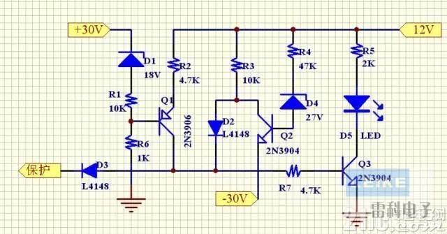 ●當(dāng)負(fù)電壓短路時(shí),電壓升高至串聯(lián)于Q2基極上穩(wěn)壓二極管,使Q2截止時(shí),Q2集電極上的電壓信號經(jīng)過D2即可送出保護(hù)信號。
